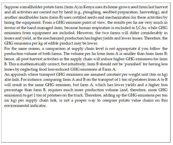 27]. To evaluate the four scenarios, neither one nor the other of these approaches suits the goal of a fair comparison. The reason for that is the absence of a backward calculation for losses, although the approach for scaling up GHG emissions from the edible quantities to the entire product matches the way of thinking. When comparing two separate production systems, losses and productivity are generally not taken into account—for example, a comparison between a farmer harvesting 500 kg of potatoes from 1 ha and another farmer producing 1000 kg from 1 ha (all else equal) would be unfair if it did not take into account the losses and productivity differences. Therefore, it is desirable to calculate the GHG emissions along the chain backwards from a specified quantity of product at the point of sale. Using this approach in the example above would realistically show how the first farmer produces less efficiently, requiring more inputs (land, water and others) and hence, producing more GHG emissions for every kilogram of potatoes at the point of sale. The following example (