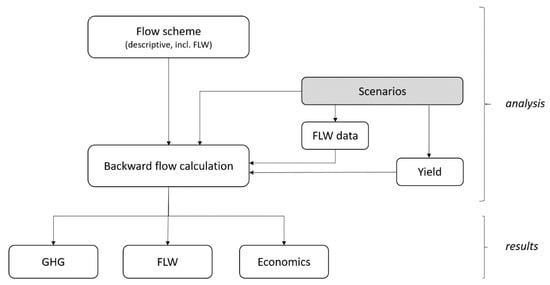Besides GHG emissions, FLW and economic factors are also included in the analysis. For scenario 1 (the reference situation) and scenarios 2–4, calculations on FLW and economic impact are carried out in [