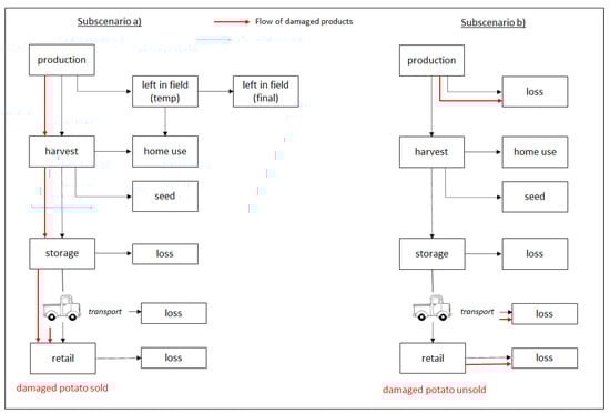 17], wholesalers/retailers still receive 50% of the market potato price for cut or bruised potatoes. It is plausible that these potatoes are used for human consumption, and eventually bad parts are cut off before preparing a meal. Hence, some part of these damaged potatoes become waste, and another part is still consumed. It is assumed that the price paid for the damaged potato reflects the percentage of edible parts of the potatoes. If the paid price is 50% of the regular price, then 116 kg of the 232 kg damaged potatoes are added to waste and also 116 kg is incorporated in the availability of potato for human consumption in the context of food security. This corresponds to subscenario (a). In subscenario (b), damaged products are unsold and this approach, using the economic loss as a proxy for the volume of FLW, is not necessary.