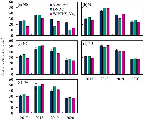 Measured and simulated potato tuber fresh yield from 2017 to 2020 for different N application treatments using the DNDC and WHCNS_Veg models in Wuchuan, China. (a) N0 treatment; (b) N1 treatment (c) N2 treatment (d) N3 treatment (e) N4 treatment. Vertical bars are standard deviations (n = 3). The N3 treatment was used to the calibrate the model parameters.