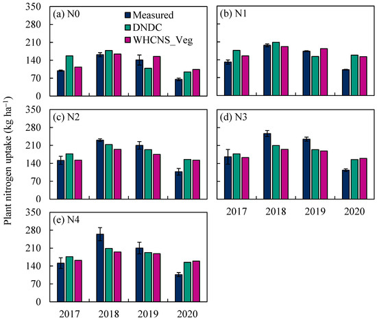 Measured and simulated potato plant N uptake from 2017 to 2020 for different N application treatments using the DNDC and WHCNS_Veg models in Wuchuan, China. (a) N0 treatment; (b) N1 treatment (c) N2 treatment (d) N3 treatment (e) N4 treatment. Vertical bars are standard deviations (n = 3).
