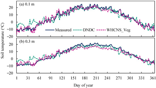 The simulated dynamics of soil temperature were in excellent agreement with the measurements in the 0.1 m and 0.3 m soil depths in both models (Figure 3) with the statistical values of EF > 0.8 and d > 0.9 (Table 5 and Table 6). The DNDC model overpredicted soil temperature of 0.1 m soil layer based on NARE > 0, but the WHCNS_Veg model underpredicted (NARE < 0). He et al. [20,44] previously reported the excellent performance of the DNDC model in the simulating of topsoil temperature. Both models underestimated the soil temperature at 0.3 m soil depth, and the WHCNS_Veg model (0.93) was more accurate than the DNDC model (0.87) based on the EF values (Table 6) due to the DNDC model overestimating temperature of the 0–0.3 m soil layer for the first 60 days of the year (Figure 3). Meanwhile, the linear regression results also showed a good agreement between the measured and simulated soil temperature (Figure S3), and the slopes ranged from 0.82 to 0.95 (R2 = 0.91–0.98, p < 0.001).