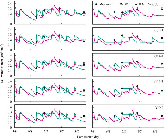 Daily simulated and measured soil moisture in the 0–0.2 m (the left of the figure) and 0.2–0.4 m (the right of the figure) in Wuchuan, China. (a) N0 treatment; (b) N1 treatment (c) N2 treatment (d) N3 treatment (e) N4 treatment. Vertical bars represent standard deviations (n = 3).