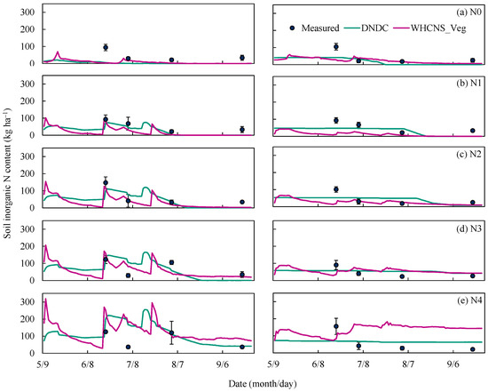 Daily simulated and measured soil inorganic N content at soil layer of 0–0.2 m (the left of the figure) and 0.2–0.4 m (the right of the figure) in Wuchuan, China. (a) N0 treatment; (b) N1 treatment (c) N2 treatment (d) N3 treatment (e) N4 treatment. Vertical bars represent standard deviations (n = 3).