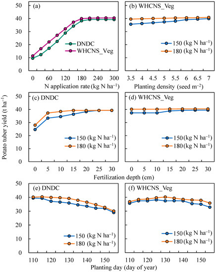 Sensitivity analysis was used to evaluate the response of the simulated results to the variation of the input parameters. The well-calibrated DNDC and WHCNS_Veg models were used to test how potato tuber yield was influenced by N fertilizer management (e.g., application rate, timing, and depth) and cultivation practices (planting date and density) (Table 2). The management practices of N3 treatment as baseline scenario compared with the scenarios under the situation of changing one of the input parameters while keeping the remaining parameters constant. The simulation results were observed with the response curves of the tuber yield to the different management practices (Figure 6 and Figure S7). The tested input parameters, except for plant density, had significant impacts on tuber yield.