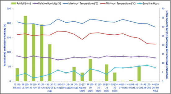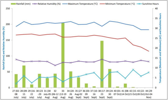 The experimental site is situated in a humid subtropical climate. The two years mean minimum and maximum temperatures ranged from 16.2 °C to 19.3 °C and 29.3 °C to 30.2 °C, respectively, with a total rainfall of 109.92 mm and 155.53 mm received during the cropping season of 2014 and 2015, respectively (Figure 1 and Figure 2).