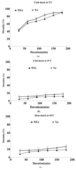 To evaluate the direct effect of temperature stress in both the aphids, the mortality rate of the adults was calculated after 30 min of exposure to thermal stress up until 3 h (Figure 1). A 3 h exposure to 5 °C resulted in initial mortality percentages of 41.69% (NVr) and 43.85% (Vr), which gradually increased to around 90% for both the aphids after cold shock (Figure 1A).The mortality percentage was significantly lowered when the aphid populations were treated at 15 °C, showing initial mortality of about 4.62% for NVr aphids and 10.49% for Vr aphids, which finally led to 11.53% mortality, which is comparatively lower than 17.78% mortality for Vr (Figure 1B). With an increase in thermal stress, i.e., at 38 °C, a similar kind of mortality percentage was observed, with an initial mortality percentage of 8.13% for NVr aphids and 16.41% for Vr aphids. The aphid population was finally reduced after 3 h exposure, with a mortality percentage of 18.74% for NVr aphids and 26.32% for Vr aphids (Figure 1C).