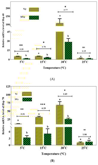 Treatment of Vr and NVr aphids with different temperatures (5 °C, 15 °C, 38 °C, and 25 °C acting as the control) resulted in varying changes in the transcript level of Hsps (Figure 2). At the control temperature of 25 °C, the transcript levels of three Hsps did not differ significantly (p > 0.05 in all the genes) between Vr and NVr aphids. Following cold temperature treatment (5 °C), the transcript levels of Hsp40 (Figure 2A), Hsp70 (Figure 2B), and Hsp90 (Figure 2C) were significantly (p < 0.05 in all the genes) upregulated in Vr aphid as compared to NVr aphids. The ratios of Vr to NVr aphids in terms of transcript levels of Hsp40, Hsp70, and Hsp90 were 3.29, 3.31, and 3.29, respectively. Temperature treatment at 15 °C resulted in insignificantly (p < 0.05 in all the genes) higher transcript levels of the three Hsps in Vr aphids compared to NVr aphids. The ratios of Vr to NVr aphids in terms of transcript levels of Hsp40, Hsp70, and Hsp90 were 1.76, 6.29, and 6.40, respectively. Similarly, heat shock treatment (38 °C) also resulted in higher transcript levels of Hsp40, Hsp70, and Hsp90 (p <0.05 in all the genes) in Vr aphids compared to NVr aphids. The ratios of Vr to NVr aphids were 3.77, 2.63, and 2.65, respectively.