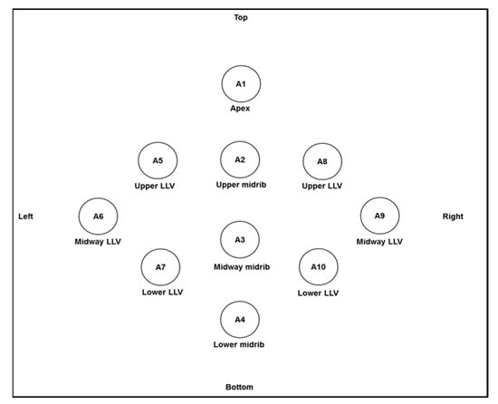 The viable plate count technique was used to confirm the BCA dosage. At the point of early head development, the lettuce plants were spray-inoculated with a hand sprayer in fine droplets and sprayed until just before run-off with the individual BCA or with sterile distilled water for the negative and positive controls. Five doses tested were 5 × 105, 5 × 106, 5 × 107, 5 × 108 and 5 × 109 CFU/mL for Serenade and spores/mL for Prestop. Four hours after the BCA application, plants were similarly spray inoculated with B. cinerea (macro-conidial dosage of 1 × 106 spores/mL), except for the negative control which was sprayed with sterile distilled water. For 48 h, the glasshouse ventilation windows were closed to encourage infection and after 48 h, two older leaves from each plant (defined by their larger size and marked with a permanent marker at the time of inoculation) of similar size and shape were collected and surface sterilized. Phylloplane leaf surface washing consisted of initially using slow running cold tap water, followed by a 1 min wash in tween 80 solution (1 drop in 200 mL sterile distilled water), re-washed with sterile distilled water twice, then surface sterilized with a wash in 70% ethanol for 1 min. The residual alcohol was removed by washing twice in sterile distilled water, followed by leaf drying under a fume hood for 2 h. From each older lettuce leaf, a total of ten leaf discs (10 mm diameter) were obtained and leaf parts included the apex (1 disc), midrib (3 discs) and lamina with lateral veins (6 discs). Figure 1 illustrates the relative positions of the 10 sampled leaf disc on each leaf. The discs were placed on PDA at an equal distance from each other (0.75 cm), the plate was sealed with parafilm and incubated at 20 °C for 10 days in the dark. After the incubation period, the leaf discs were assessed for the incidence of disease and/or symptoms (i.e., lesions, hyphae and necrosis). The experiment was performed twice. In each experiment for each treatment (BCA × dose), there were five biological replicates (five plants), and from each plant two of the oldest leaves were obtained for experimentation (two replicates). Therefore, each treatment dose contained a total of twenty leaves. The testing followed a randomised block design.