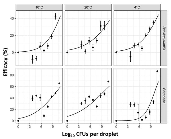 Efficacy from in vitro competition assays of B. subtilis and Serenade at tested inoculum doses inhibiting growth from a B. cinerea mycelial plug at 4, 10 and 20 °C; the bars represent one standard error and the curve is a fitted logistic model.