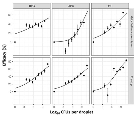 Similarly, for the Gliocladium, both temperature and formulation affected (p < 0.001) the observed dose–response relationship. The effect of dose was less profound at 10 °C for the unformulated strain (Figure 3).