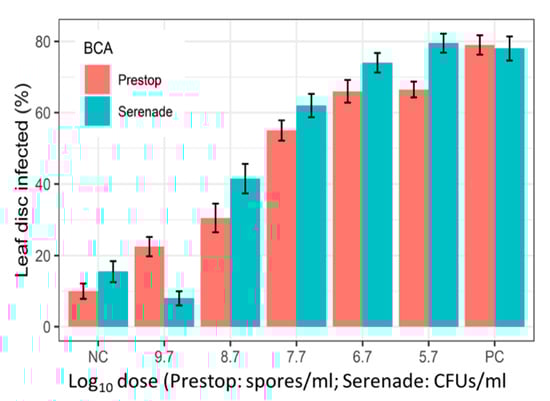 Overall percent L. sativa leaf disc infected with B. cinerea when post-inoculation challenged with two formulated biocontrol products (Prestop and Serenade) at a number of doses in a glasshouse at 17–22 °C with a RH range of 60–100%. NC: negative control (only sterile water was applied) and PC: positive control (inoculated with B. cinerea but not treated with BCA).