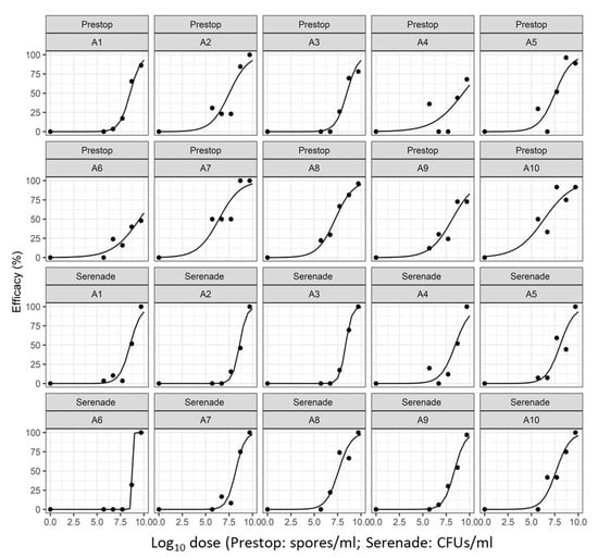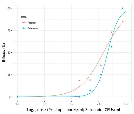 Logistic models satisfactorily described the observed dose–response relationships (Figure 5). The response curve is steeper (p < 0.05) for Serenade than for Prestop. However, LD50 for both BCAs were close, at around log10 8.0 CFUs or spores/mL (see Figure 5).