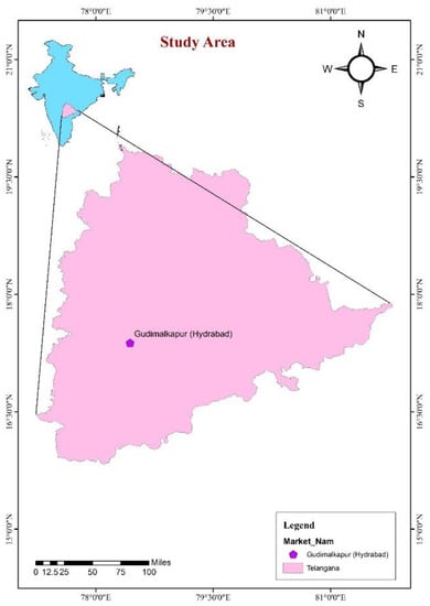 The secondary data on tomato prices and arrivals were collected daily from 1 January 2020 to 30 June 2020 from the website http://tsmarketing.in/DailyArrivalsnPricesCommBetweenDates.aspx, accessed on 12 September 2020. The Government of India announced a nationwide lockdown from 25 March 2021 to 30 June 2020; thus, 25 March 2020 was considered as the intervention date and the data from 1 January 2020 to 24 March 2020 were considered as the pre-intervention period, whereas the data from 25 March 2021 to 30 June 2020 were considered as the post-intervention period. For modeling and forecasting, the data from 1 January 2020 to 23 June 2020 was used for model building and the data from 24 June 2020 to 30 June 2020 were used for model testing and validation. The map of the study area is shown in the Figure 1.