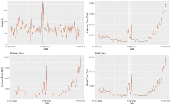 Figure 3 shows the time series of supplies, maximum price, minimum price, and modal price in the Gudimalkapur market, where the blue line indicates the intervention date, i.e., 25 March 2020, when the government of India announced the lockdown.