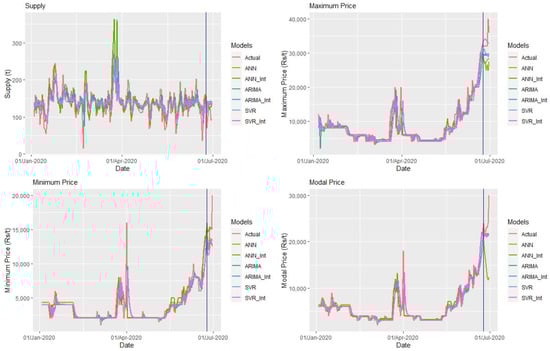 The results show that the lockdown has a negative effect on tomato supply and a positive effect on tomato price series. About 600 kg of tomatoes per day were supplied less due to the lockdown. The results also showed that the maximum price increased by Rs.17.1/t/day, minimum price increased by Rs.18/t/day, and modal price increased by Rs.12.5/t/day. The negative impact of the lockdown on deliveries is likely to be related to the decline in production during this period and could also be due to the problems faced by farmers and suppliers in transporting tomatoes to the market. The low volume of deliveries might have contributed to the higher price, which is evident from the positive impact of the lockdown on the price series. The forecasting performance of the six selected models—ARIMA, ARIMA intervention, SVR, SVR intervention, ANN, and ANN intervention—was evaluated for their forecasting ability based on model errors in both training and test data sets. Based on the MAPE values obtained (Table 7), the ANN intervention model outperformed the ANN and other models in both model building and validation data sets for the supply and price time series. The ANN intervention model also performed better than ANN and the other models in both the training and test data sets for the price series. The predicted values of the ARIMA and ARIMA intervention models, as well as the SVR models, produced the same predicted values for all days, implying that the model does not have the generalization ability to provide different predicted values compared to the ANN intervention models.