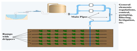 Although the smart sensor is the central device of the drip irrigation system in this paper, it is composed of several other elements. These must be compatible with each other and adapted to the requirements of the crops and the characteristics of the irrigated plot. These elements fall into seven main categories: