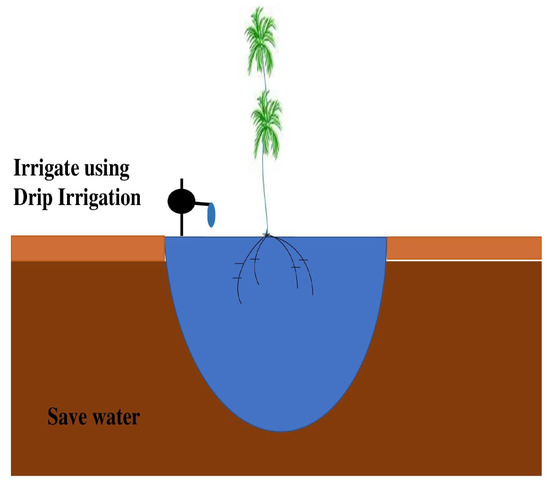 The drip irrigation method was invented by the Israelis in the 1970s [24]. Water is provided frequently, often daily, to maintain good soil moisture levels. Figure 2 shows the proliferation of water stress in a plant with good water use methods.