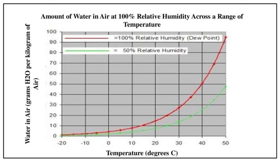 This result confirms the graph that is developed by [30], which shows that as the air temperature increases, the amount of water needed to saturate it increases exponentially. A few degrees of temperature increase have an increasingly important effect on the saturation point. Air that is saturated with water is at a relative humidity of 100%.