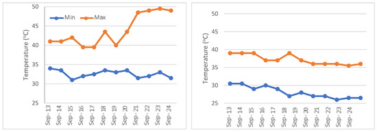 At 50% flowering, heat stress was applied in September for 12 days. By constructing a polythene tunnel, the considerable temperature was elevated in the daytime and uncovered at night [41]. During heat stress, the temperature of control and tunnel was recorded twice a day [42]. The maximum and minimum temperature was measured inside the tunnel with the help of a digital thermometer (Figure 1).