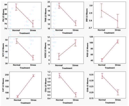 After initial validation, the standard least-square effects fit applied on all test accessions across different conditions revealed that all genotypes performed sigSuppnificantly differently for studied characters under normal and heat stress conditions (Tables S2–S10). Summary of effect tests as presented in Table 1 and Figure 2 indicating the least square effects of heat stress on all parents and their hybrids were significant regarding all studied traits. The genotype × treatment interaction was also significant for all studied traits (Table 1).