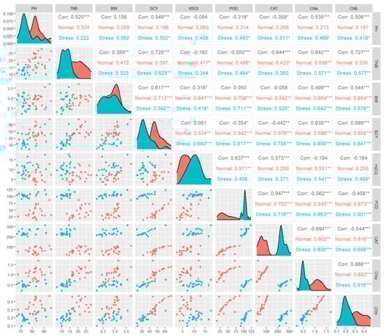 Correlogram depicting correlations among nine studied traits across Normal and Heat stress conditions in the upper triangle and their scatterplot matrix in the lower triangle. Diagonals are the density distribution of the study traits—the Red Color represents Normal, whereas the green color represents Heat Stress conditions. * = Significance (α = 0.05), ** = Significance (α = 0.01), *** = Significance (α = 0.001).