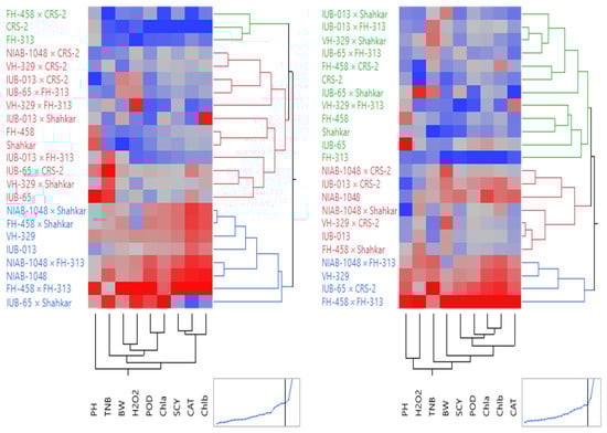 Hierarchical clustering analysis was executed to clusters the 8 parents and their 15F1 hybrid based on agronomical and ionic traits under normal and heat stress conditions. Under normal conditions, 23 genotypes were clustered into 3 groups. Groups 1, 2 and 3 consists of 12, 3 and 8 genotypes, respectively (Figure 4). Under heat stress, 23 genotypes were also clustered in 3 groups. Group 1, 2 and 3 contained 7, 12 and 4 genotypes, respectively (Figure 4). Under normal and heat stress conditions, different clusters were represented by different colors. Generally, the genotypes of cluster 3 have shown unchanged agronomic performance along with unchanged or higher values of biochemical traits across normal and stress conditions have been designated as heat tolerant. The second cluster have shown a nominal decrease in agronomic traits along with increased biochemical performance have been denoted as moderately tolerant. The third cluster with red color based on declined agronomic performance along with a decreased biochemical performance under stress have been designated as susceptible. Based on clustering, under normal and heat stress conditions, among parents and their hybrids, NIAB-1048 × FH-313, VH-329, NIAB-1048, IUB-65 × CRS-2, and FH-458 × FH-313 were superior genotypes for most of the studied traits. The cluster analysis also validated the prediction of desirability plots and showed that FH-458 × FH-313 performed well in yield and physiological traits under both conditions. The genotypes in obtained clusters under both conditions are given in (Table S11).