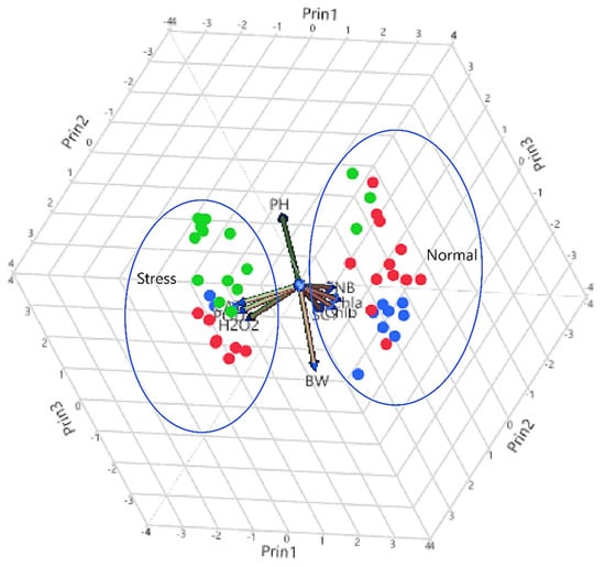 A 3D Scatterplot based on PC1, PC2, and PC3 displays different traits under normal and heat stress. Blue, green and red dots are representing three different groups of genotypes based on clustering as well as PCA across normal and heat stress.