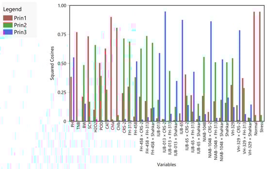 The PCA results showed that the first three components explained 86.931% variability to the total variation. The yield and biochemical characters are illustrated by factor map squared cosines (Figure 6). It is deduced that the higher values of squared cosines offer an adequate contribution to the particular variable. The PC-I covered TNB, SCY, POD, CAT and chlorophyll contents (a & b). PC-II covers the traits like BW and H2O2. The PC3 only contained PH. The treatment effects also fell in PC1. The genotype IUB-65 × CRS-2 and VH-329 × FH-313 were covered by PC-1. The genotype CRS-2, FH-313, FH-458 × CRS-2, FH-458 × FH-313, FH-458 × Shahkar, IUB-013 × FH-313, NIAB-1048, NIAB-1048 × FH-313, VH-329 and Shahkar were covered by PC-2 and the rest of all genotypes were fell in PC3 (Figure 6).
