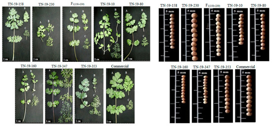 Seed, leaf form, and size of testers and genotypes used in the modified triple test cross. (A) longest basal, (B) middle, and (C) top leaves, respectively.