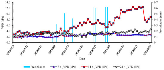 Average daily (24 h) vapor-pressure deficit (VPD) value and number of rainy days after commencement of the tests. VPD and precipitation (mm) in the field tests at 7:00 a.m., 2:00 p.m., and 9:00 p.m., and rainy days.