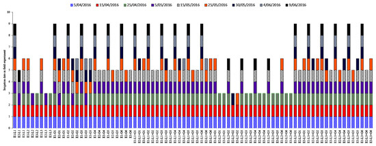 The experiment was implemented at the research field of Tarbiat Modares University in Tehran, Iran (51°09′ E; 35°44′ N, at an altitude of 1265 m above sea level). Before sowing, the seeds were disinfected in sodium hypochlorite solution (10%) (Sigma-Aldrich, Saint Louis, MI, USA) for 5 min and then fixed in ethanol (96%) for 1 min and rinsed in distilled water thereafter [31]. The 9 parents, 12 single crosses, and 6 three-way crosses were evaluated with different levels of water deficit (C, MWD, SWD) with a randomized complete block design with 3 replications. In the C regime, genotypes were kept well-watered. For MWD, genotypes were well-irrigated until the commencement of stem elongation, when watering was withdrawn until the end of the flowering stage. Then, recovery water was applied once. In the SWD experiment, watering was like that of C until the commencement of the flowering stage, after which watering was cut off completely [32]. The field’s soil had a sandy loam structure consisting of 15% silt, 15% clay, and 70% sand with 700 and 125 mg kg−1K and P, respectively, as well as 0.12% N, 1.21% organic carbon and 21.1% fixed carbon. The soil had a relatively low electrical conductivity of 1.01 dS m−1. The field daily vapor pressure deficit (VPD), corresponding precipitation, and rainy days are presented in Figure 2.