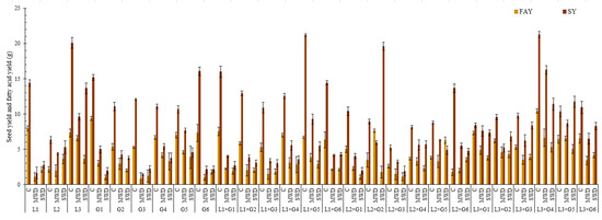 Water treatment (WT) × genotype interaction effect on seed yield (SY) and fatty acid yield (FAY). C: control; MWD: moderate water deficit; SWD: severe water deficit. L1–L3: three testers, G1–G6: 6 male parents; L1G1–L2G6: 12 single hybrids; and L3G1–L3G6: 6 three-way hybrids in a modified triple test cross.