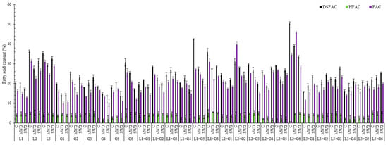 Water treatment (WT) × genotype interaction effect on dehulled seed fatty acid content (DSFAC), hull fatty acid content (HFAC), and whole fatty acid content (FAC). C: control; MWD: moderate water deficit; SWD: severe water deficit. L1–L3: 3 testers, G1–G6: 6 male parents; L1G1–L2G6: 12 single hybrids, and L3G1–L3G6: 6 three-way hybrids in a modified triple test cross.
