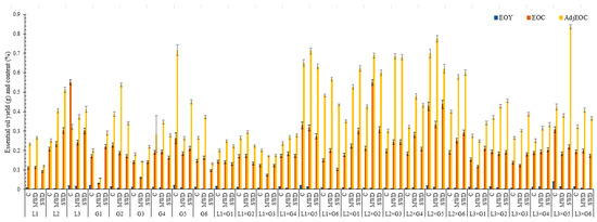 The genotypes showed different responses to irrigation regimes for HFAC, DSFAC, and FAC (Figure 6). In C, MWD, and SWD conditions, the greatest mean value of FAC was detected for the , , and L2, respectively. The EOC, adjusted essential oil content (AdjEOC), and EOY exhibited significant water treatment × genotype interactions (Figure 7). Furthermore, in C, L3 and in C and MWD, and in SWD conditions exhibited the greatest mean values of EOC, EOY, and AdjEOC, respectively.