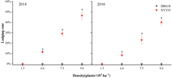 Field lodging rate of DH618 and XY335 under different planting densities in 2014 and 2016. * Significant difference at p < 0.05.