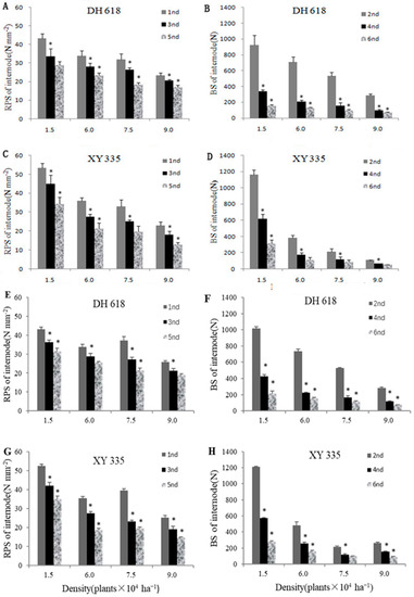 Stalk mechanical strength of DH618 and XY335 at VT + 35d. (A) RPS of internode for DH618 under different planting densities in 2014. (B) BS of internode for DH618 under different planting densities in 2014. (C) RPS of internode for XY335 under different planting densities in 2014. (D) BS of internode for XY335 under different planting densities in 2014. (E) RPS of internode for DH618 under different planting densities in 2016. (F) BS of internode for DH618 under different planting densities in 2016. (G) RPS of internode for XY335 under different planting densities in 2016. (H) BS of internode for XY335 under different planting densities in 2016. * Significant difference at p < 0.05.