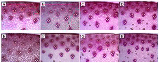 Lateral section of the third basal internodes of stem (×40) in 2014. (A–D) represent 1.5, 6.0, 7.5, 9.0 × 104 plants ha−1 for DH618, respectively; (E–H) represent 1.5, 6.0, 7.5, 9.0 × 104 plants ha−1 for XY335, respectively.