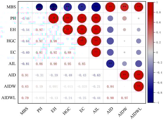 Correlation analysis. MBS: maximum bending strength, PH: plant height, EH: ear height; HCG: height of gravity center, EC: ear coefficient, AIL: average internode length, AID: average internode diameter, AIDW: average internode dry weight, AIRDWL: average of internode ratio of dry weight to length (average of internode dry weight per unit). * and ** indicate significant differences different at the 0.05 and 0.01 probability levels, respectively.