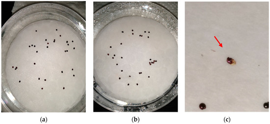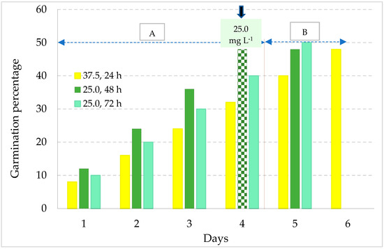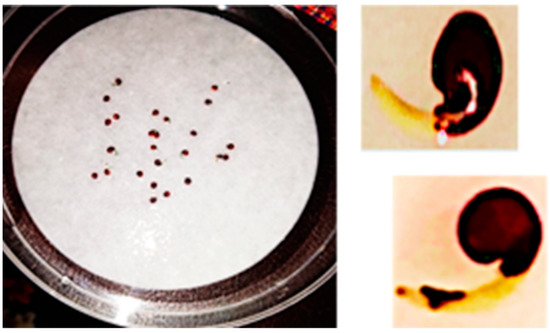 The seeds treated for 24, 48, and 72 h were assessed every 24 h during seven days, establishing as criterion the observation of a germinated seed with the appearance of the radicle (Figure 3). We considered a finished or inhibited germination process when no new germinated seeds were visible. After recording the data, the response variables: germination percentage (GP) [22], mean germination time (MGT) [23], germination rate (GR), and germination velocity coefficient (GVC) [22], were recorded for statistical analysis.