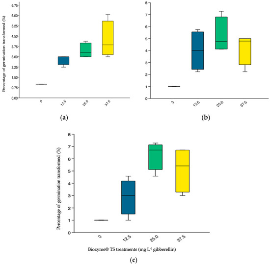 Response of germination percentage (GP) (transformed values) to Biozyme® TS (gibberellins), with: (a) 24 h, (b) 48 h, and (c) 72 h of immersion.
