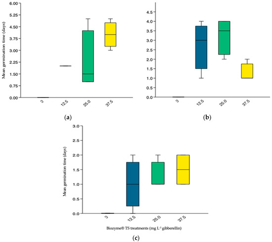 Response of mean germination time (MGT) to Biozyme® TS (gibberellins), with: (a) 24 h, (b) 48 h, and (c) 72 h of immersion.