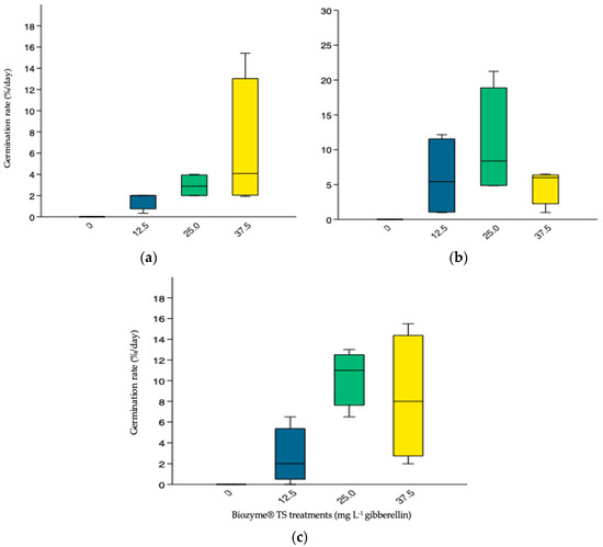 Response of germination rate (GR) to Biozyme® TS (gibberellins), with: (a) 24 h, (b) 48 h, and (c) 72 h of immersion.