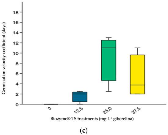 Response of germination velocity coefficient (GVC) to Biozyme® TS (gibberellins), with: (a) 24 h, (b) 48 h, and (c) 72 h of immersion.