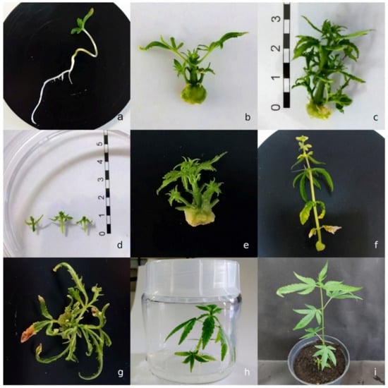 5]. It may enable shortening the time of the breeding process and/or large-scale production of homogeneous plant material. Regeneration protocols are essential for most in vitro techniques employed in plant breeding and in crop improvement using genetic transformation. However, there is still a lack of efficient and reproducible in vitro protocols for hemp. Cultivar- and genotype-dependent responses of explants and the low regeneration rate are the main limitations for hemp in vitro propagation.