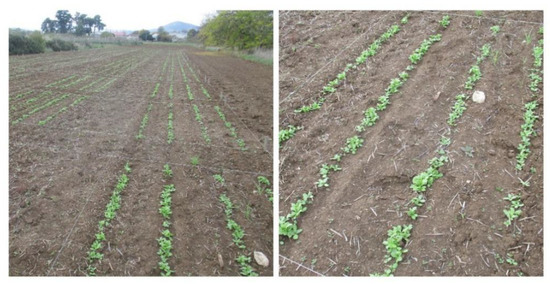 A two-year experiment was set up at the experimental field of the University of Thessaly in Velestino (Thessaly Region, Greece) during the growing seasons 2019–2020 and 2020–2021. The soil was sandy clay loam with a pH of 7.4. In the first experimental year, the total precipitation from November to May was 368.6 mm, while in the second experimental year was 273.5 mm. Two varieties of milk thistle originating from Greece were sown on 29 October in both years. The row spacing was 50 cm, while the density of the plants in the row was 13 plants m−1 (Figure 1).