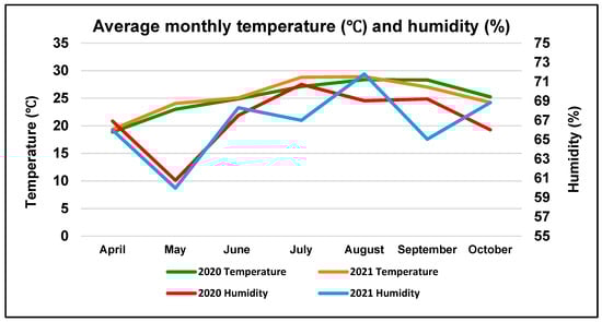 Average monthly temperature (°C) and humidity (%) of the experimental site during summers 2020 and 2021.