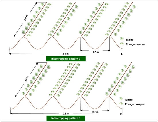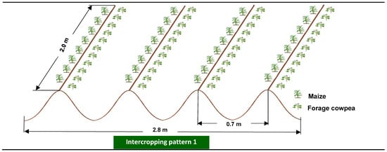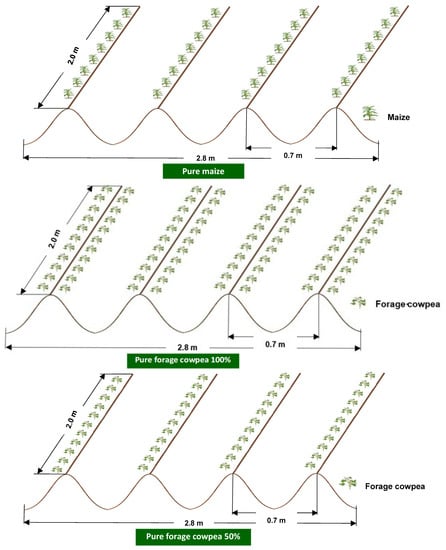 Pure maize and forage cowpea plots were included in each field replicate. Pure maize was sown in hills 20 cm apart on the upper third part of one side of the ridge, with the recommended plant density of 57,600 plant ha−1. Pure forage cowpea plots were seeded at 48 and 96 kg ha−1, to maintain 50, and 100% plant densities, respectively (Figure 3).