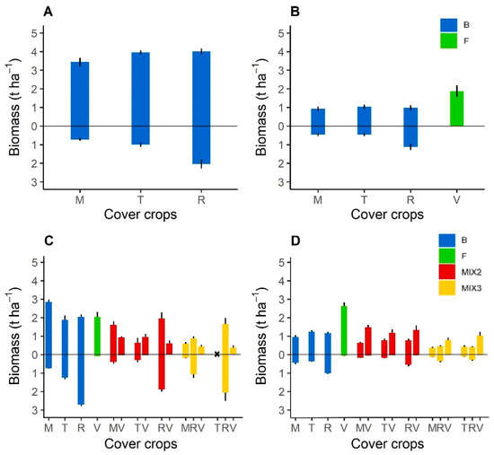 Shoot (above zero) and root (below zero) dry matter biomass (t ha−1) for each Brassicaceae or Fabaceae species cover crops in sole crops or mixtures measured at the cover crop destruction in 2016 (A), 2017 (B), 2019 (C) and 2020 (D). In 2019, the turnip rape did not grow in a mixture of fodder radish and purple vetch. Abbreviation letter refers to cover crop species with M for brown mustard, T for turnip rape, R for fodder radish, and V for purple vetch. Error bars represent standard errors.