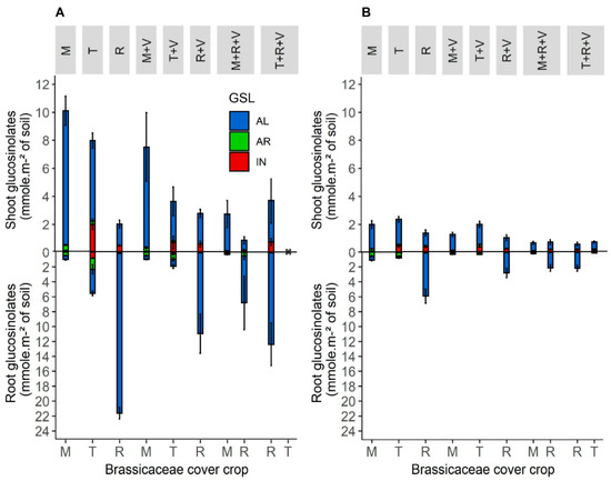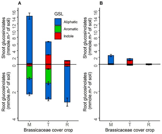 Mean shoot and root glucosinolates production function of the total dry matter biomass of each species of Brassicaceae cover crop per square meter of soil (mmol m−2 of soil) in sole crops in 2016 (A) and 2017 (B). Abbreviation letter refers to Brassicaceae cover crop with M for brown mustard, T for turnip rape, R for fodder radish. Error bars represent standard errors.